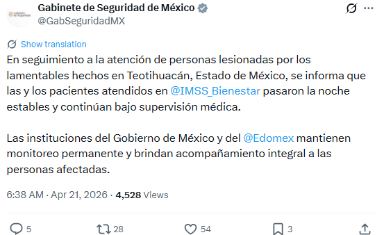 De acuerdo con el Gabinete de Seguridad, los lesionados, atendidos en hospitales del IMSS-Bienestar y otras instituciones, permanecen bajo supervisión médica continua, luego del ataque armado ocurrido en la Pirámide de la Luna.