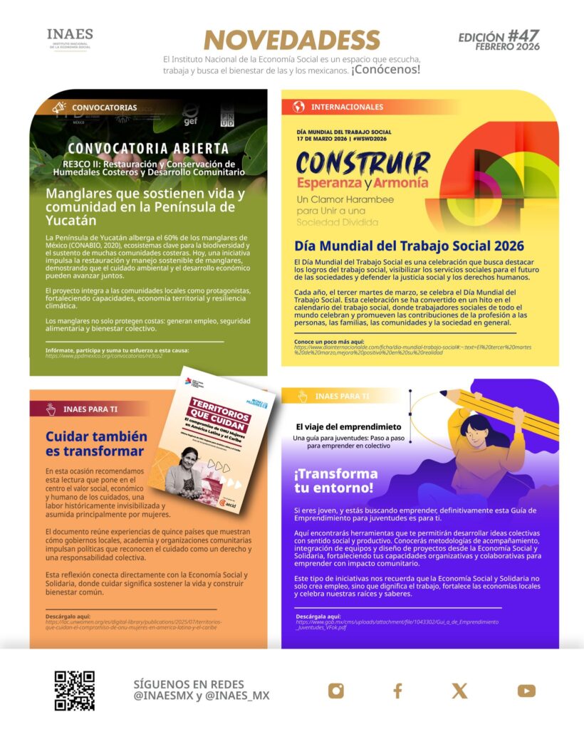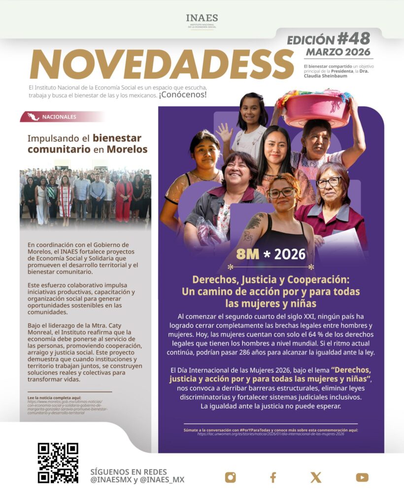Con el objetivo de fortalecer la difusión de proyectos, iniciativas y avances en materia de economía social, el Instituto Nacional de la Economía Social (INAES) presentó la edición más reciente de su publicación mensual NOVEDADESS, correspondiente a marzo, una herramienta informativa clave para quienes impulsan modelos económicos solidarios en el país.