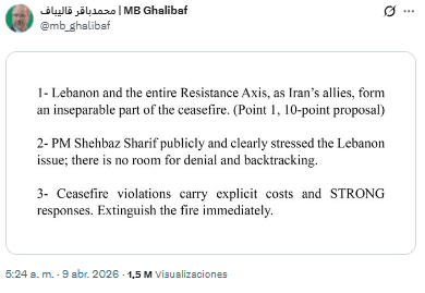 El presidente del Parlamento iraní, Mohamad Baqer Qalibaf, afirmó que el Líbano está incluido dentro del acuerdo y forma parte del llamado “Eje de la Resistencia”, por lo que ataques en ese territorio serían considerados una ruptura directa del pacto.