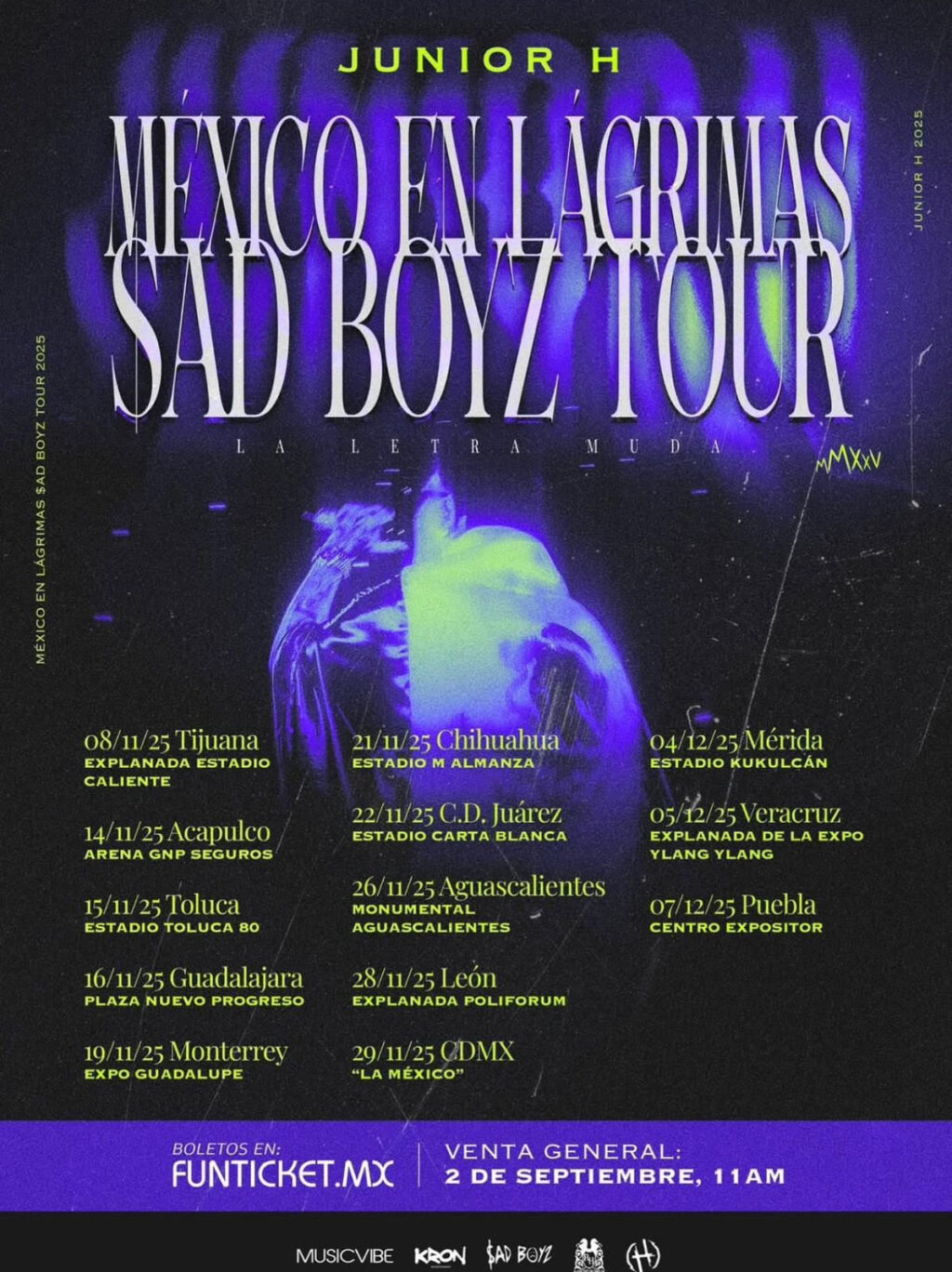 El ícono del regional mexicano Junior H anuncia su esperado regreso a México con la gira “MÉXICO EN LÁGRIMAS $AD BOYZ TOUR”, un recorrido de 13 fechas que dará inicio el 8 de noviembre en Tijuana y pasará por ciudades como Guadalajara, Monterrey y Ciudad de México, para culminar el 7 de diciembre en Puebla.