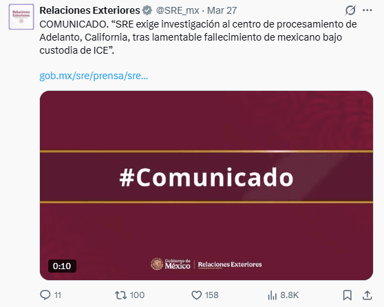 La Secretaría de Relaciones Exteriores (SRE) exigió a Estados Unidos una investigación tras la muerte de un ciudadano mexicano bajo custodia del Servicio de Inmigración y Control de Aduanas (ICE) en Adelanto, California, ocurrida el 25 de marzo.