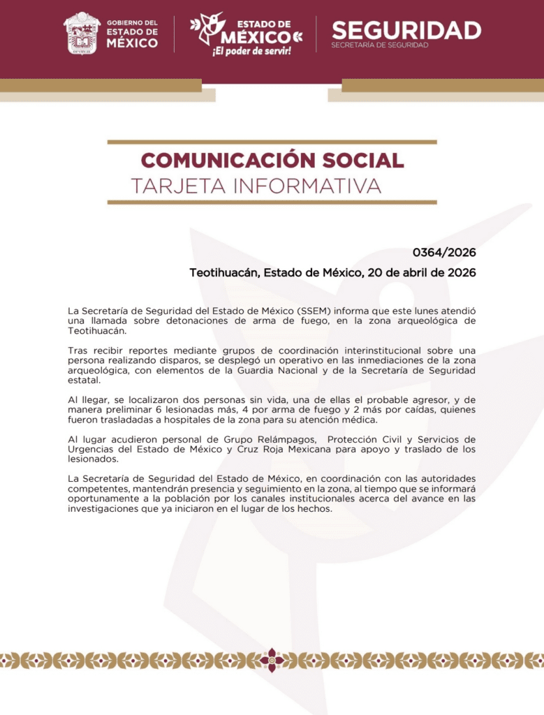 Un ataque armado en la zona arqueológica de Teotihuacán dejó como saldo la muerte de una turista canadiense y al menos seis personas heridas, tras un tiroteo ocurrido en la Pirámide de la Luna.